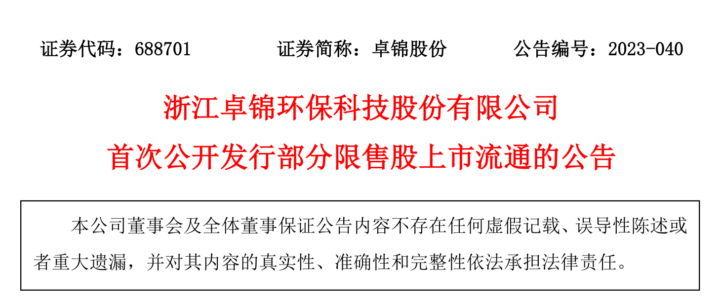 浙江卓錦環保科技股份有限公司首次公開發行部分限售股上市流通公告