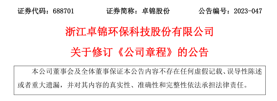 浙江卓錦環??萍脊煞萦邢薰娟P于修訂《公司章程》的公告