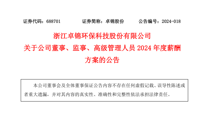 浙江卓錦環保科技股份有限公司關于公司董事、監事、高級管理人員2024年度薪酬方案的公告